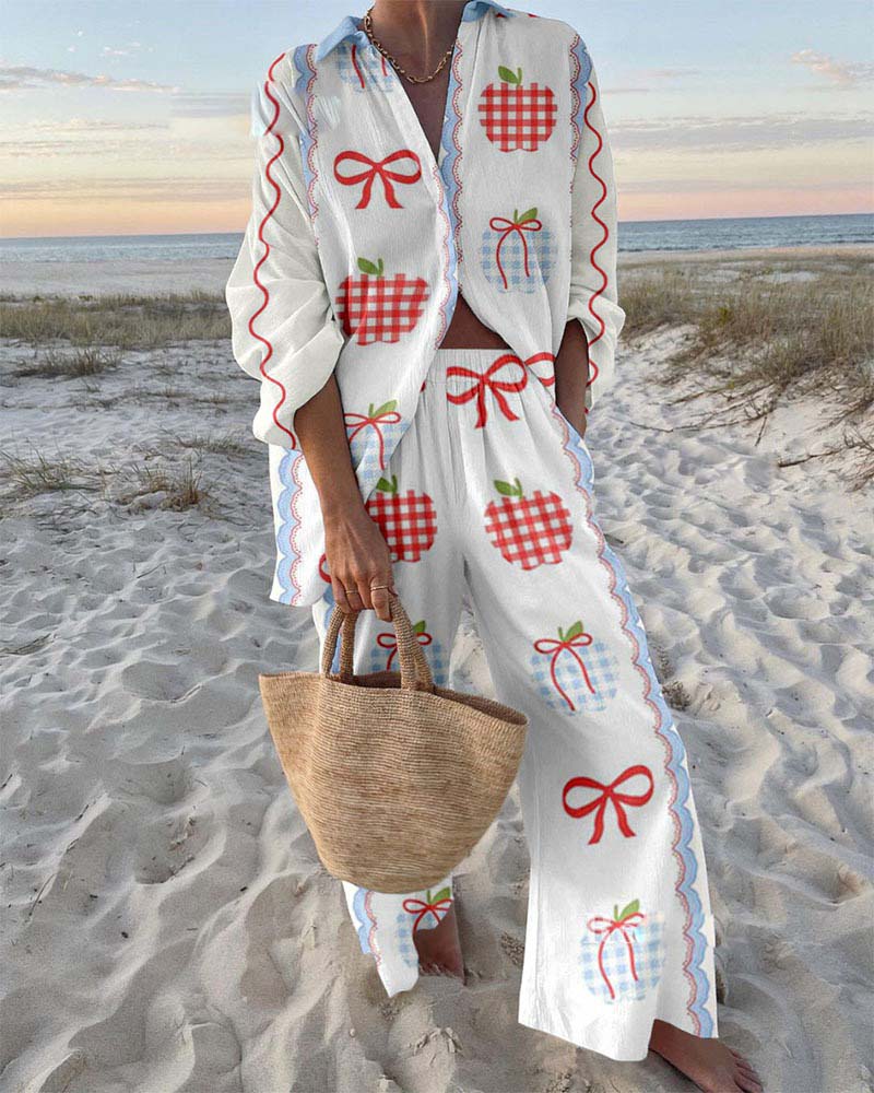Apple Bow Print Shirt & Pants Two-Piece Set