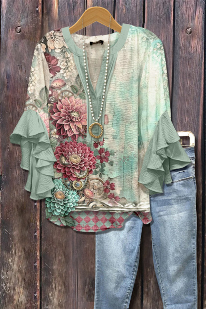 Art Floral Print Ruffle Sleeve Top