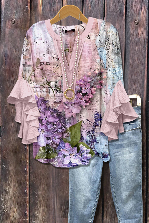 Art Floral Print Ruffle Sleeve Top