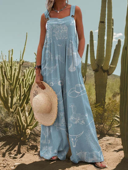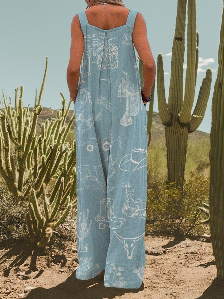 Baby Blue Women's Western Elements Print Casual Strap Wide Leg Pants