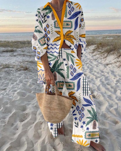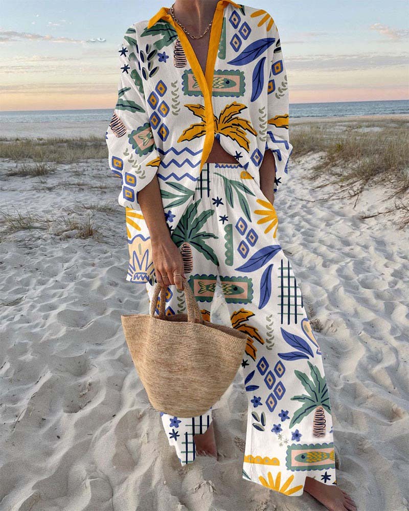 Beach Coconut Print Shirt & Pants Two-Piece Set