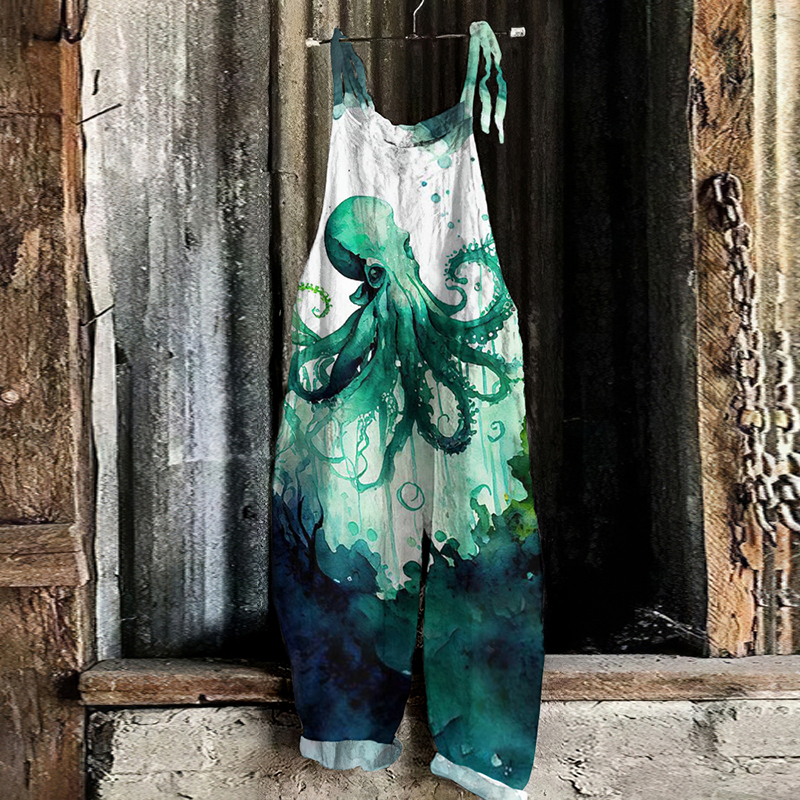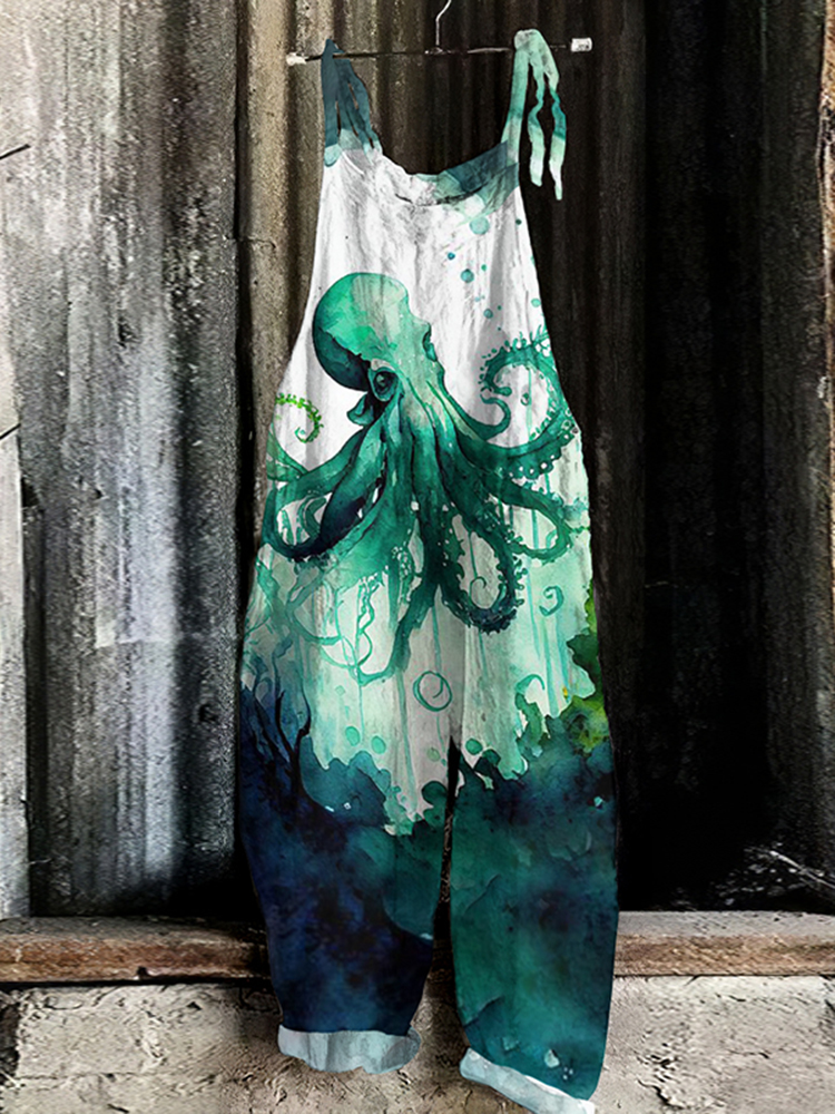Casual Octopus Watercolor Art Print Loose Jumpsuit