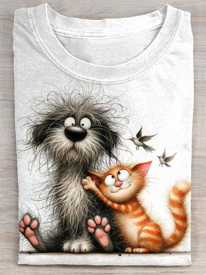 Cat Dog Lover Art Print Casual Short Sleeve T-shirt