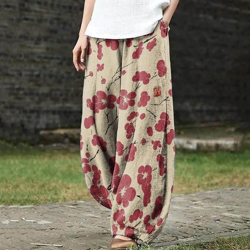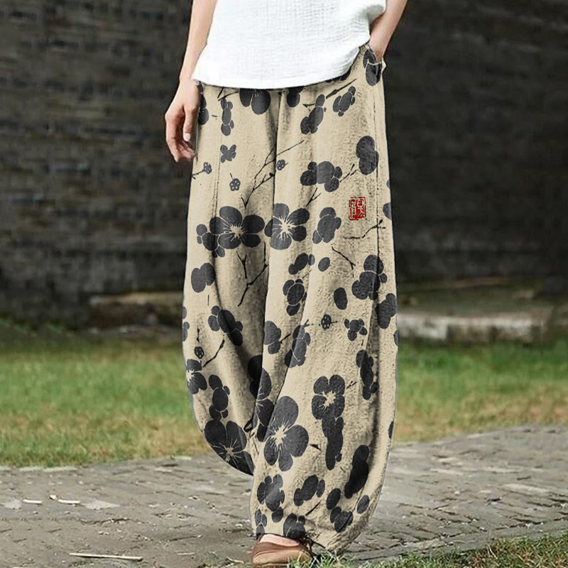 Dashingsoul Cherry Blossom Japanese Lino Art Vintage Print Casual Pants