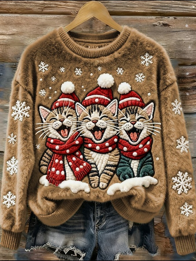 Christmas Cat Art Casual Cotton Plush Sweatshirt