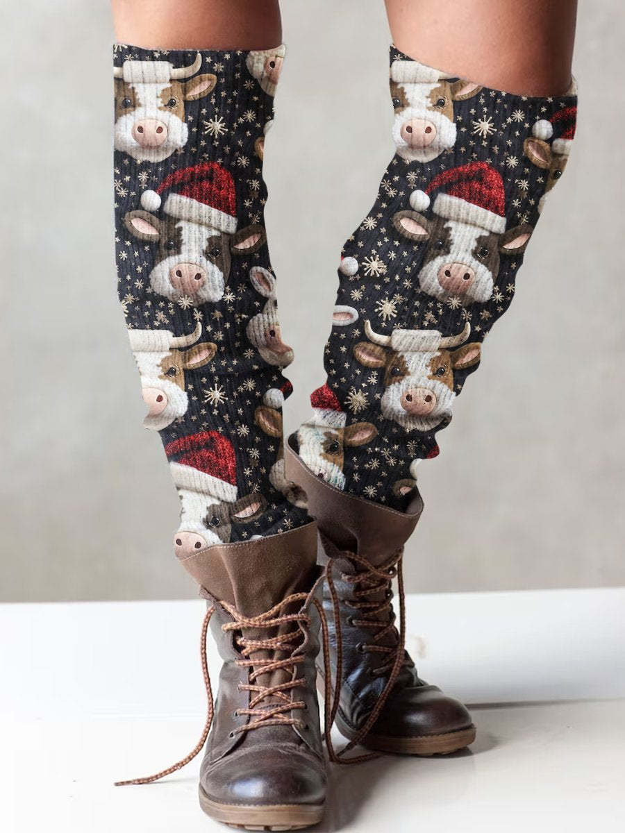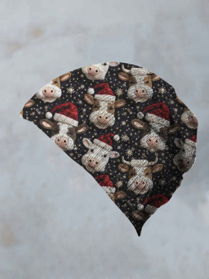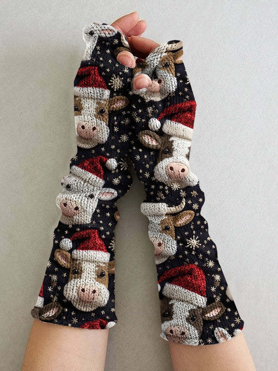 Christmas Cow Print Casual Knit Gloves, Leg Sets,Hat