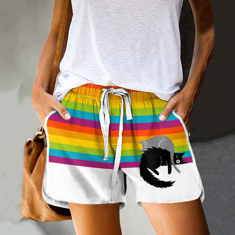 Cute Rainbow Gray Cat Black Cat Drawstring Pocket Shorts