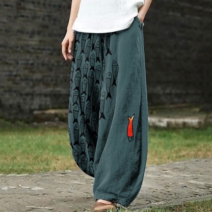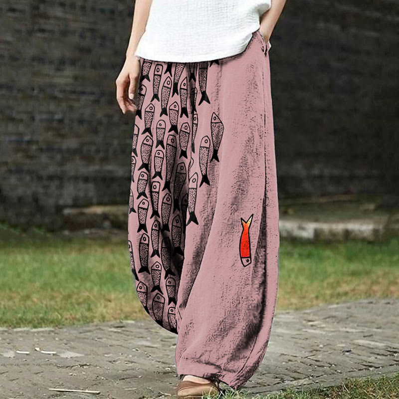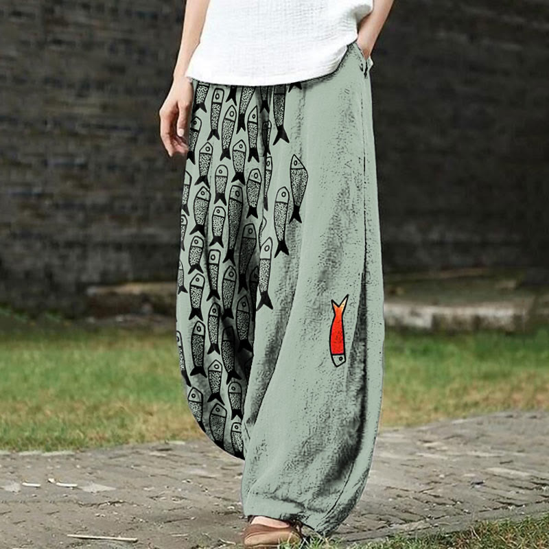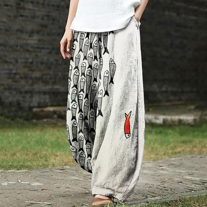 Dashingsoul Cute Simple Lines Abstract Geometric Fish Art Print Casual Pants