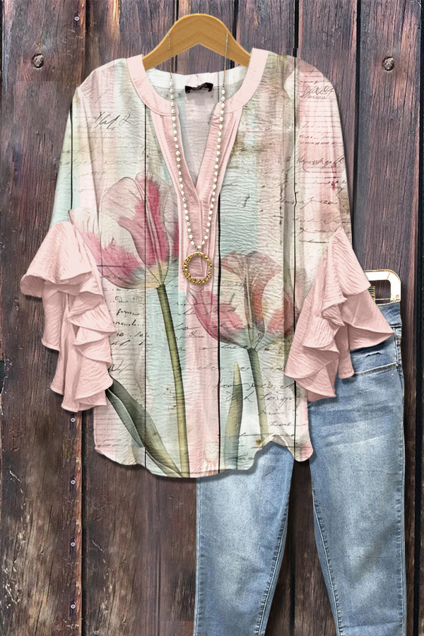 Elegant Floral Print Ruffle Sleeve Top