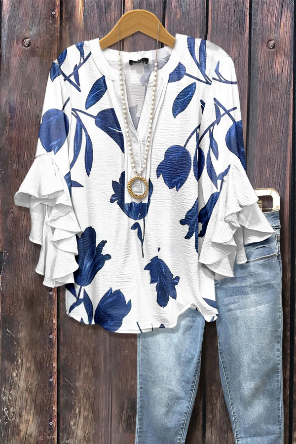 Elegant Tulip Floral Print Ruffle Sleeve Top