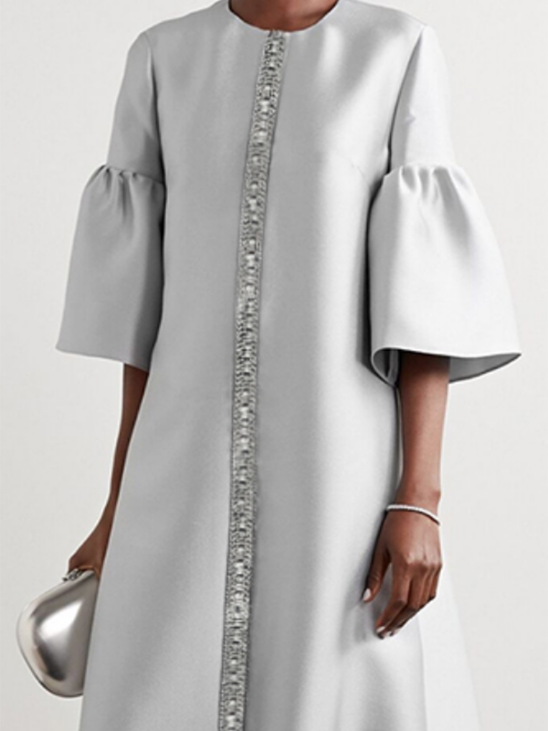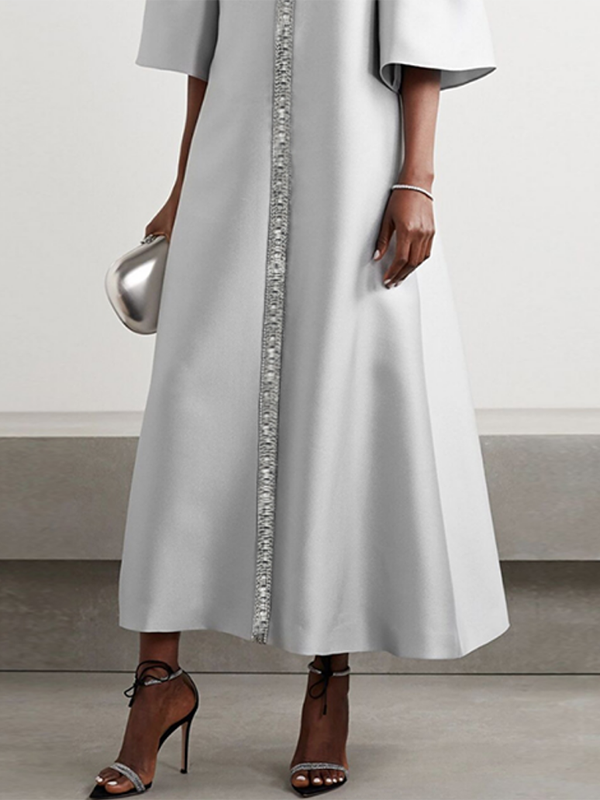 Flared Sleeves Half Sleeves Shiny Solid Color Round-Neck Midi Dresses