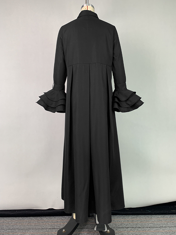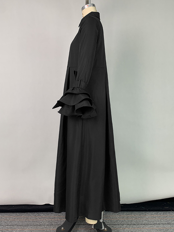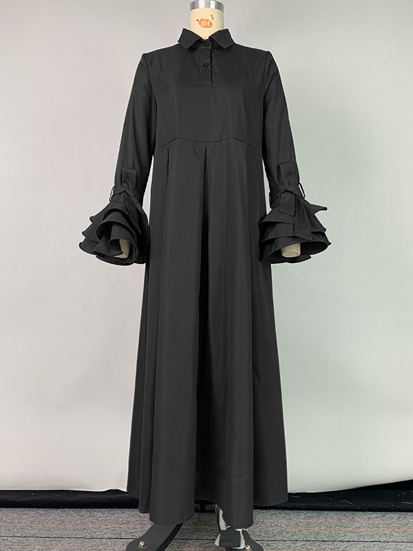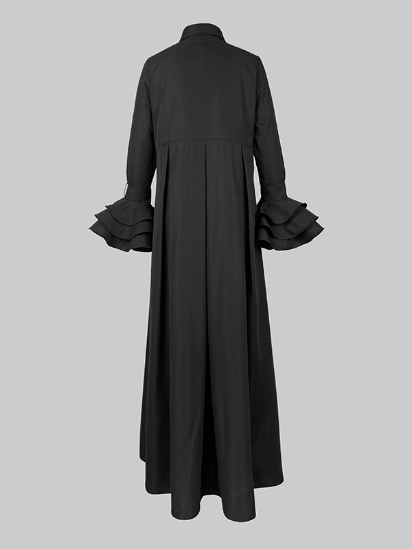 Flared Sleeves Pleated Solid Color Split-Joint Lapel Maxi Dresses Shirt Dress
