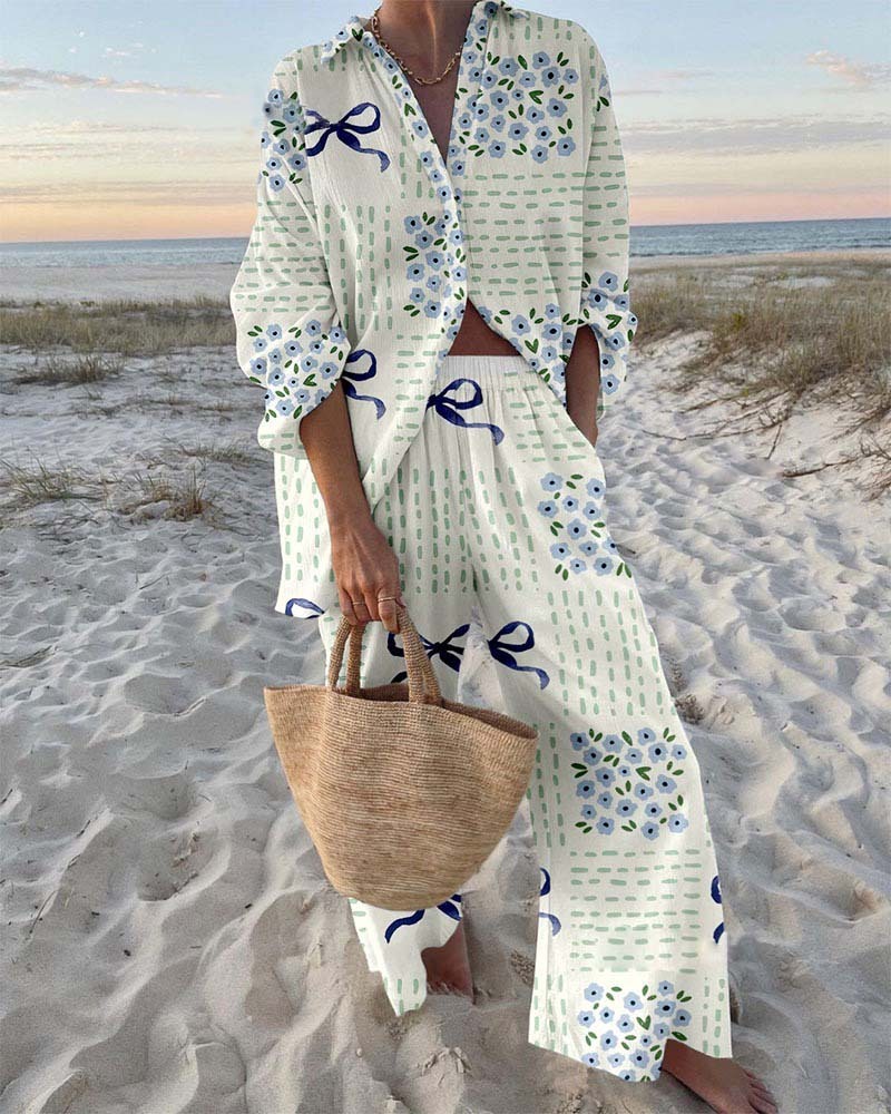 Floral Bow Print Shirt & Pants Two-Piece Set