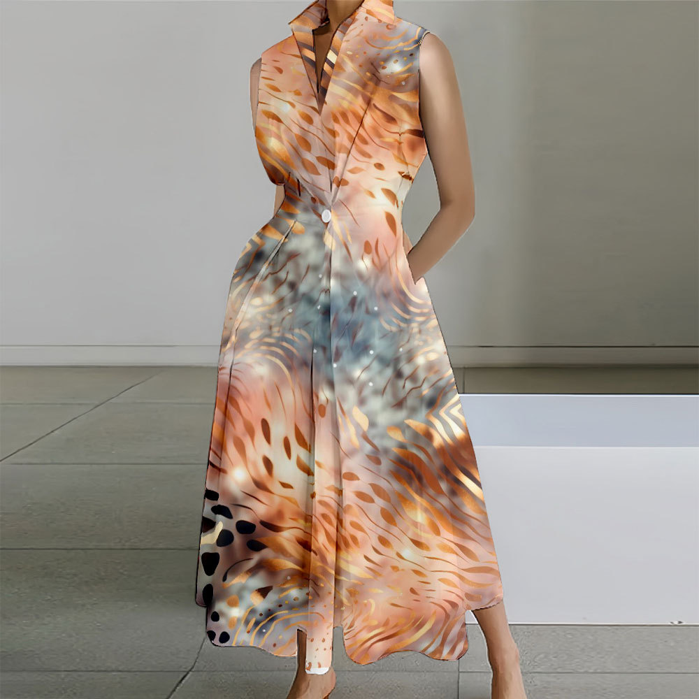 Flower Printed Sleeveless Lapel Collar Pocket Maxi Dresses