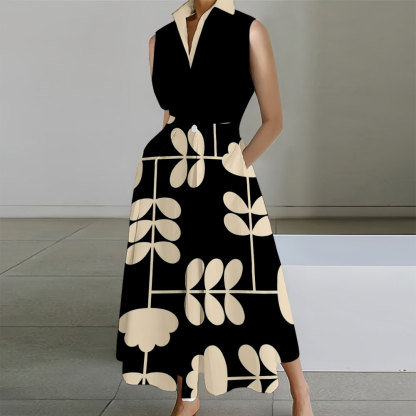 Flower Printed Sleeveless Lapel Collar Pocket Maxi Dresses