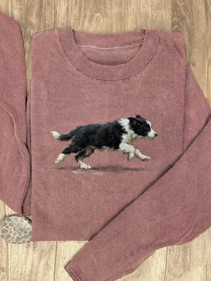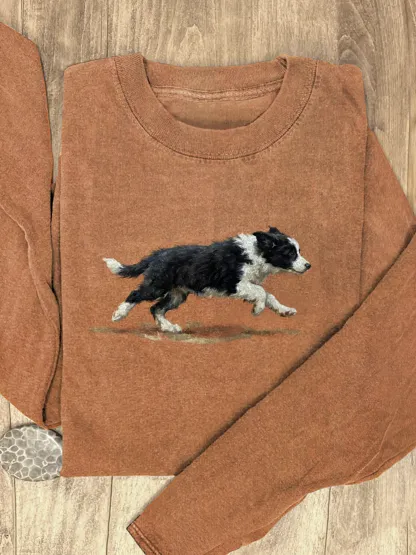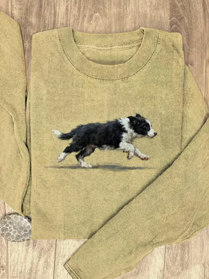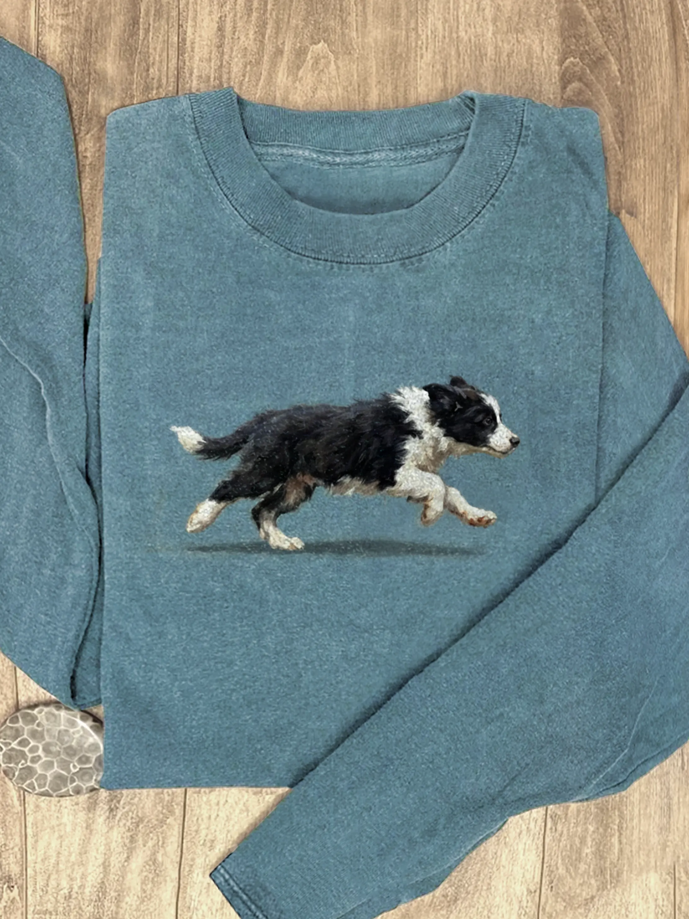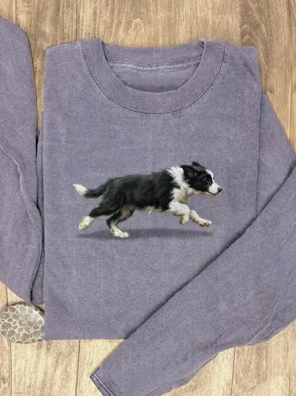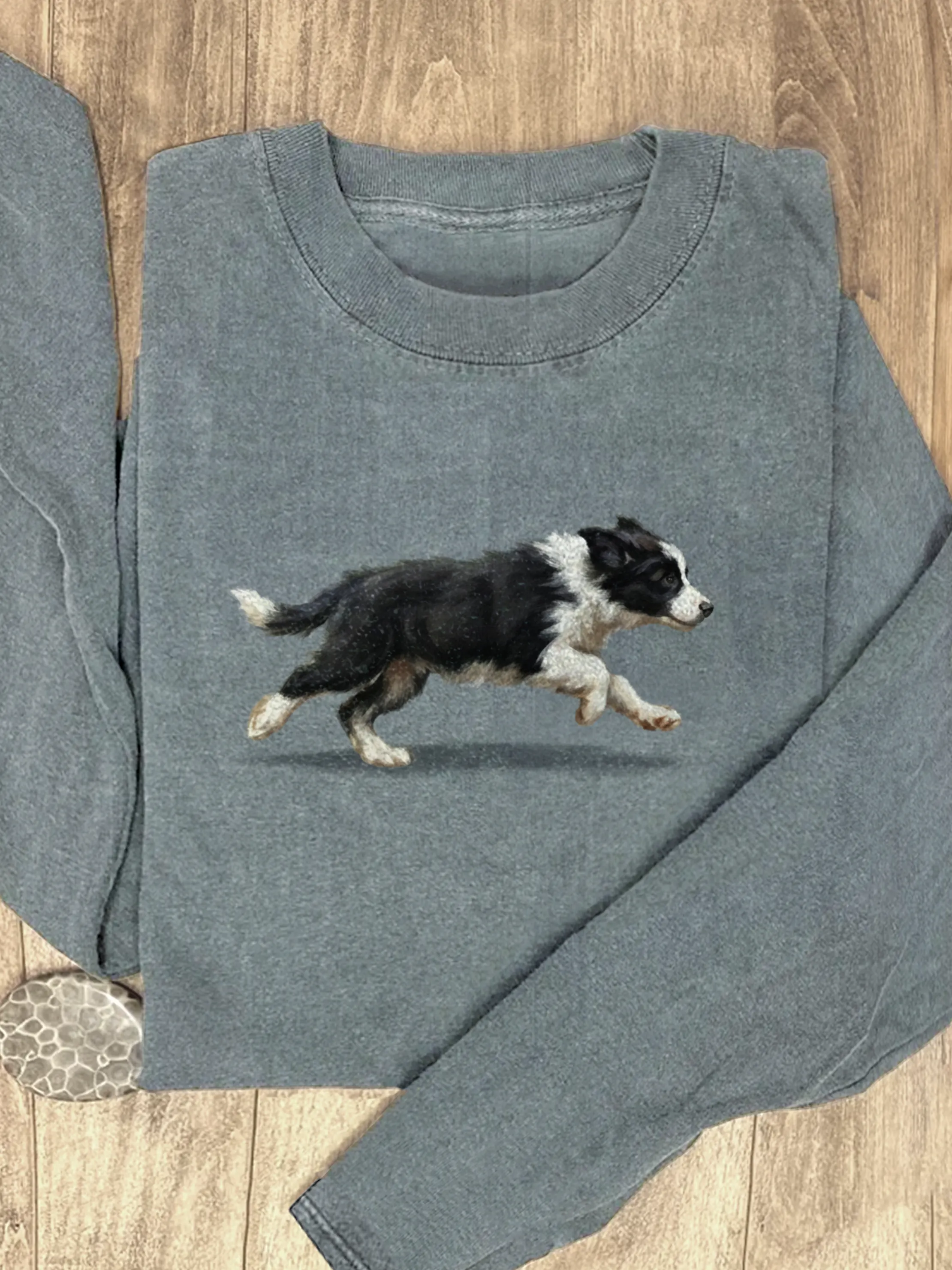Funny Cute Running Border Collie Puppy Art Print Casaul Cotton Long Sleeve Shirt