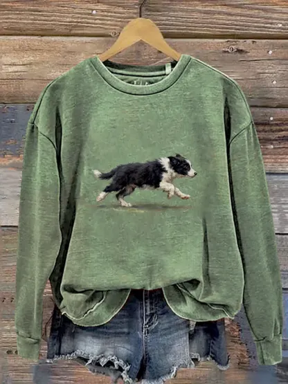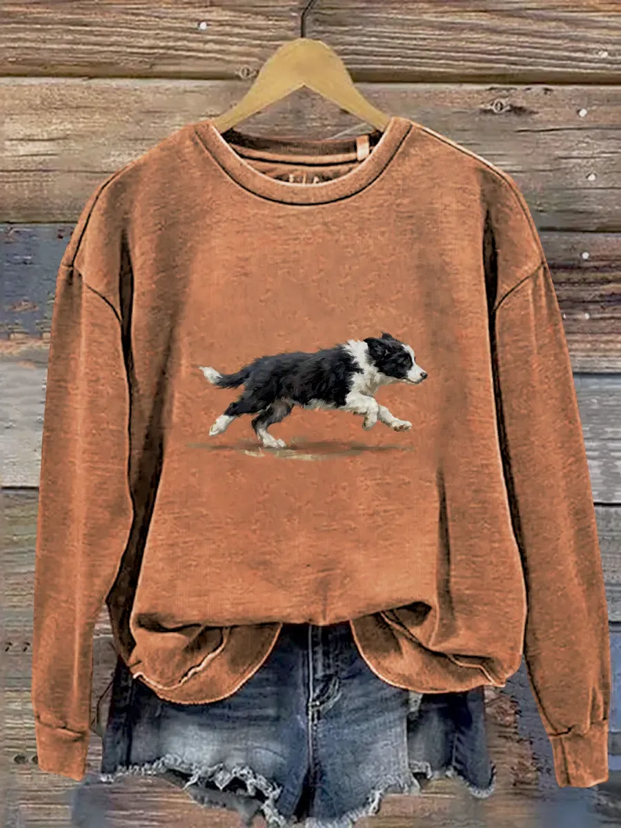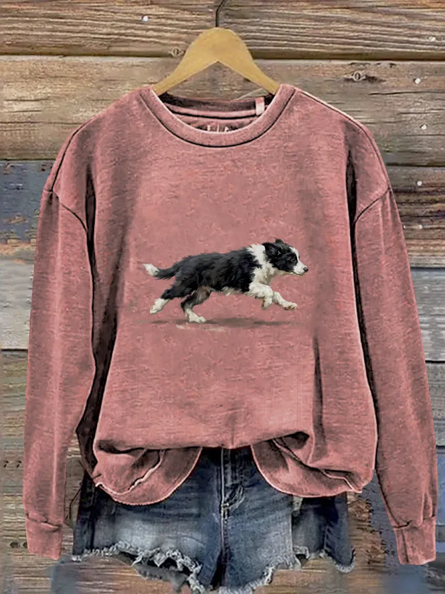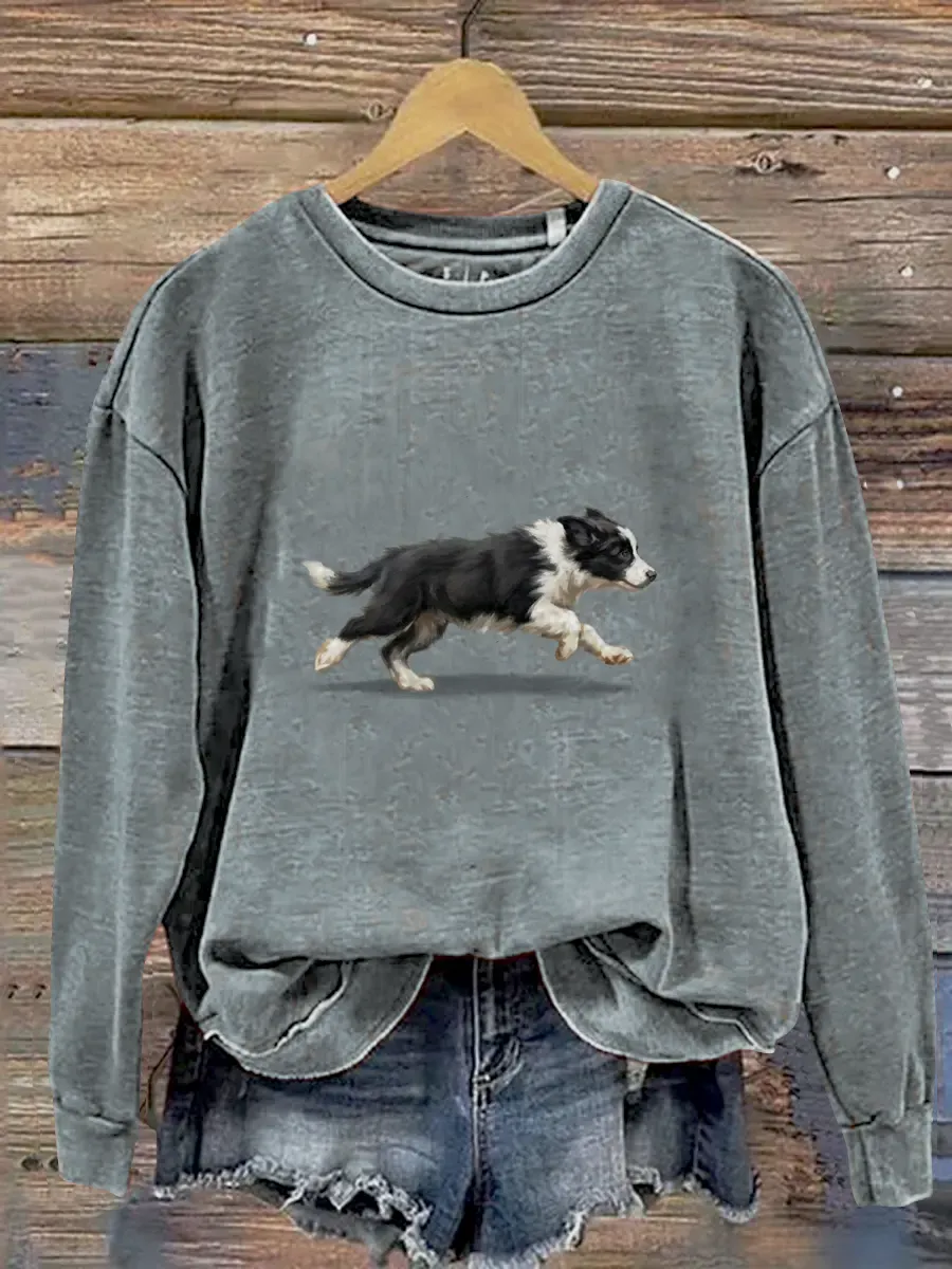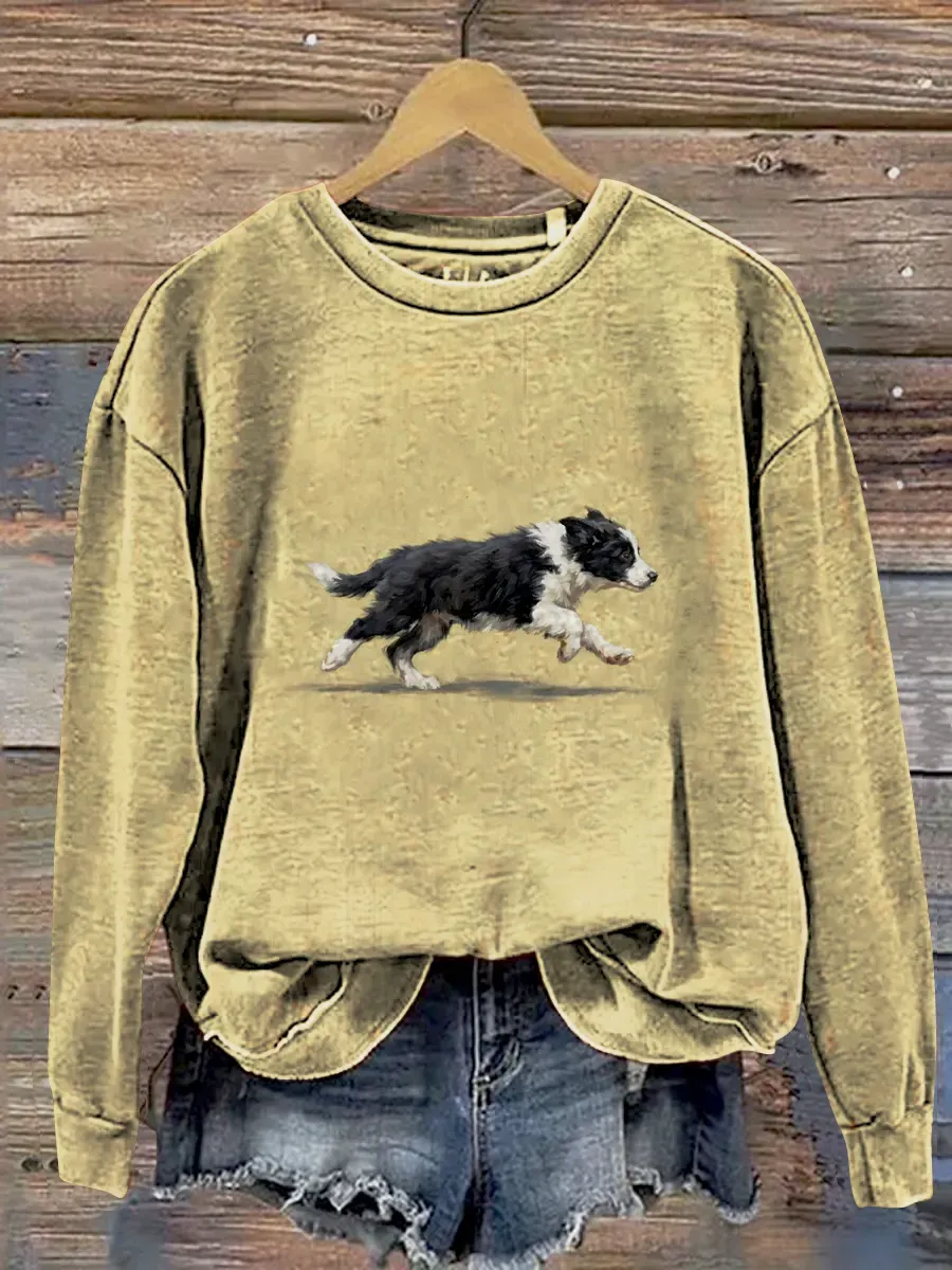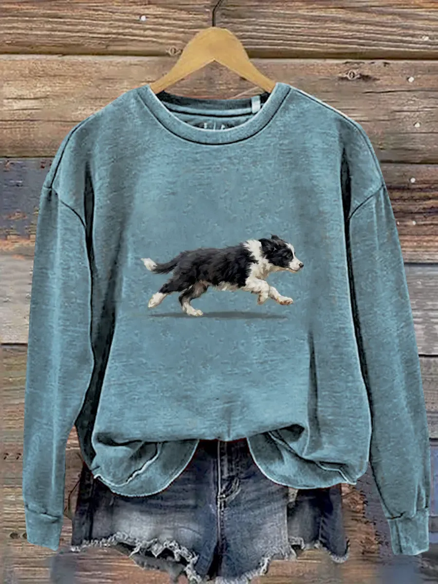 Funny Cute Running Border Collie Puppy Art Print Casual Sweatshirt