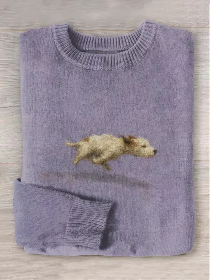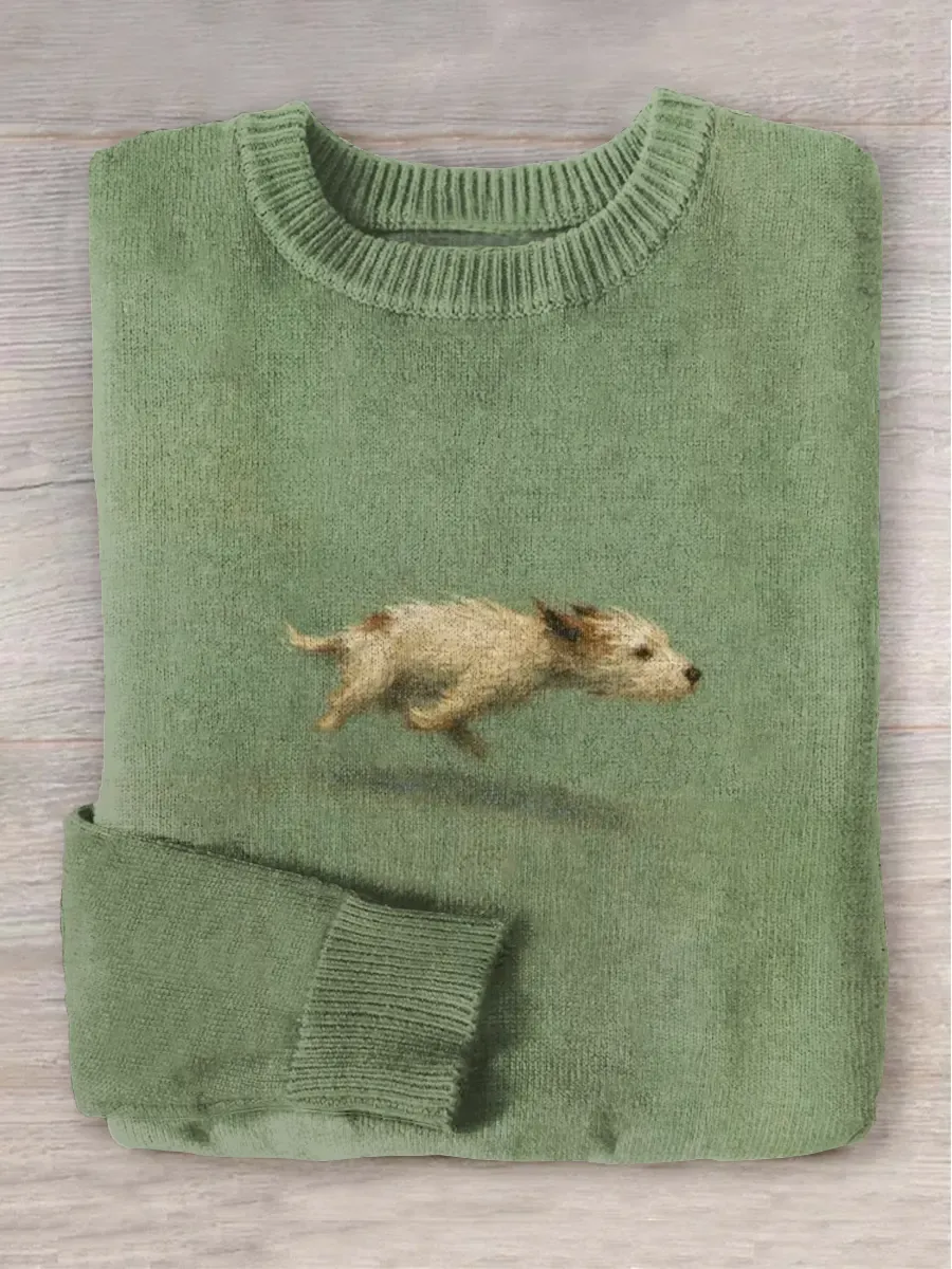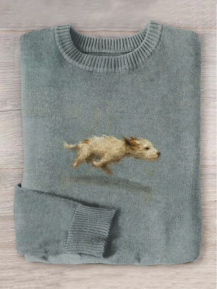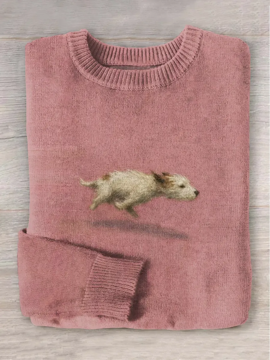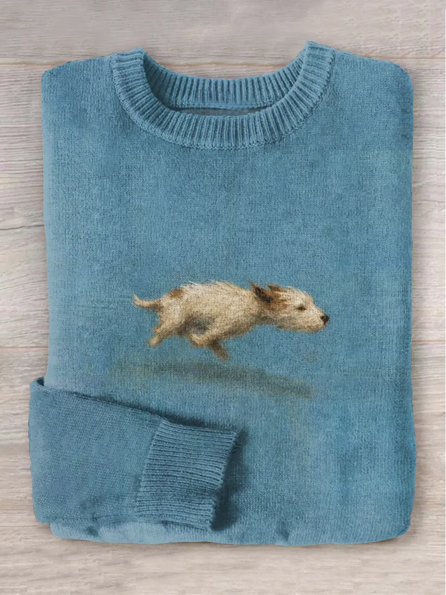 Funny Cute Running Dog Art Print Round Neck Long Sleeve Sweater