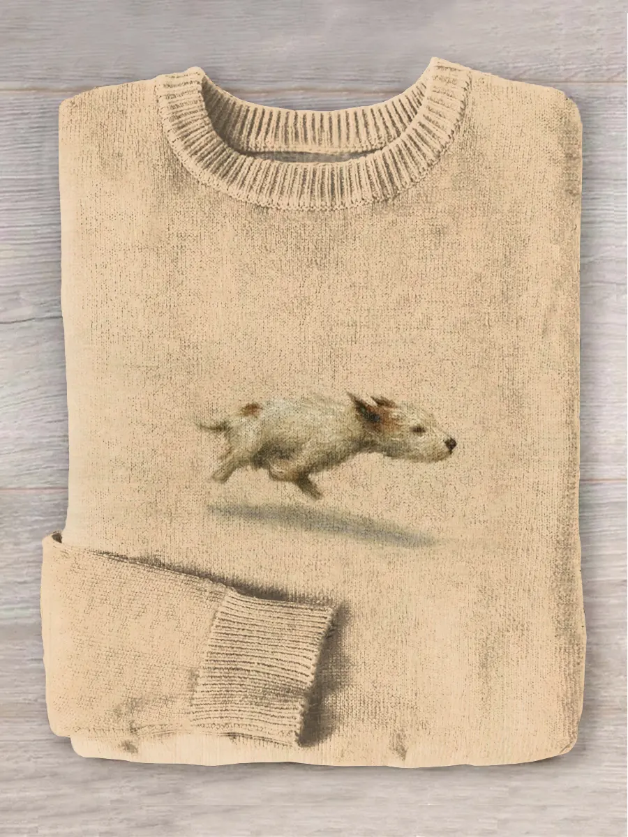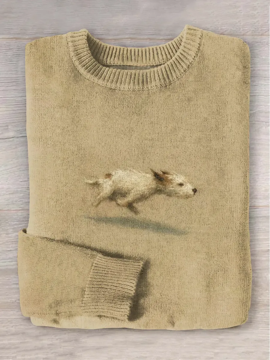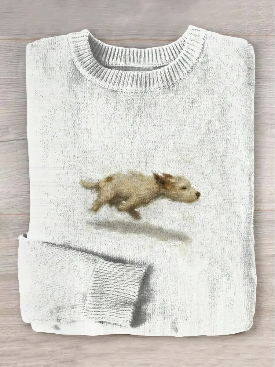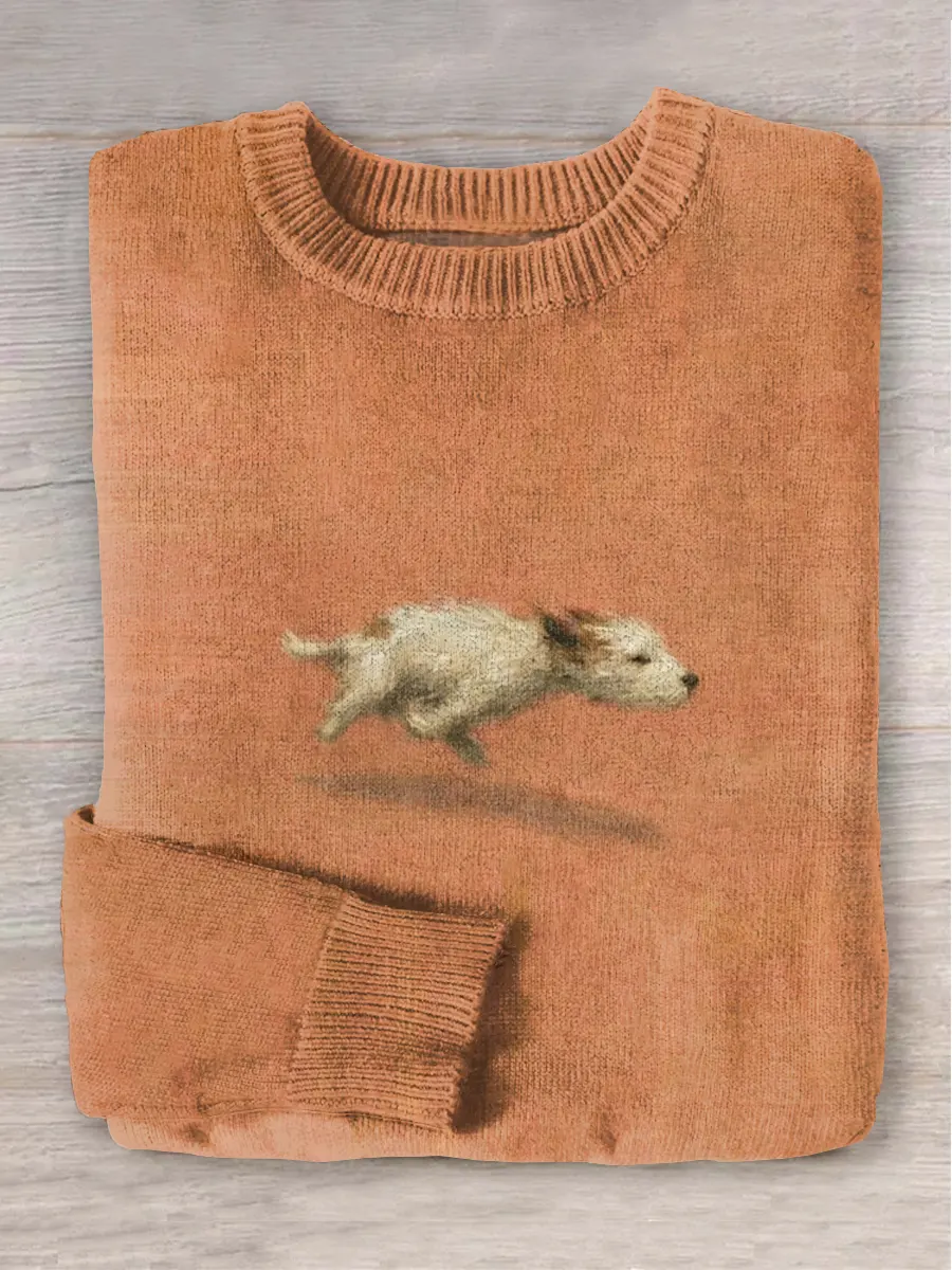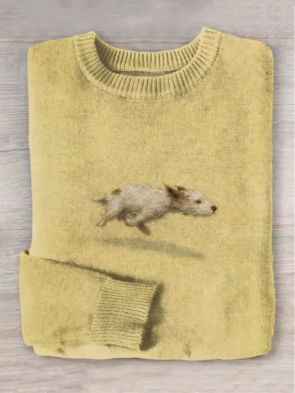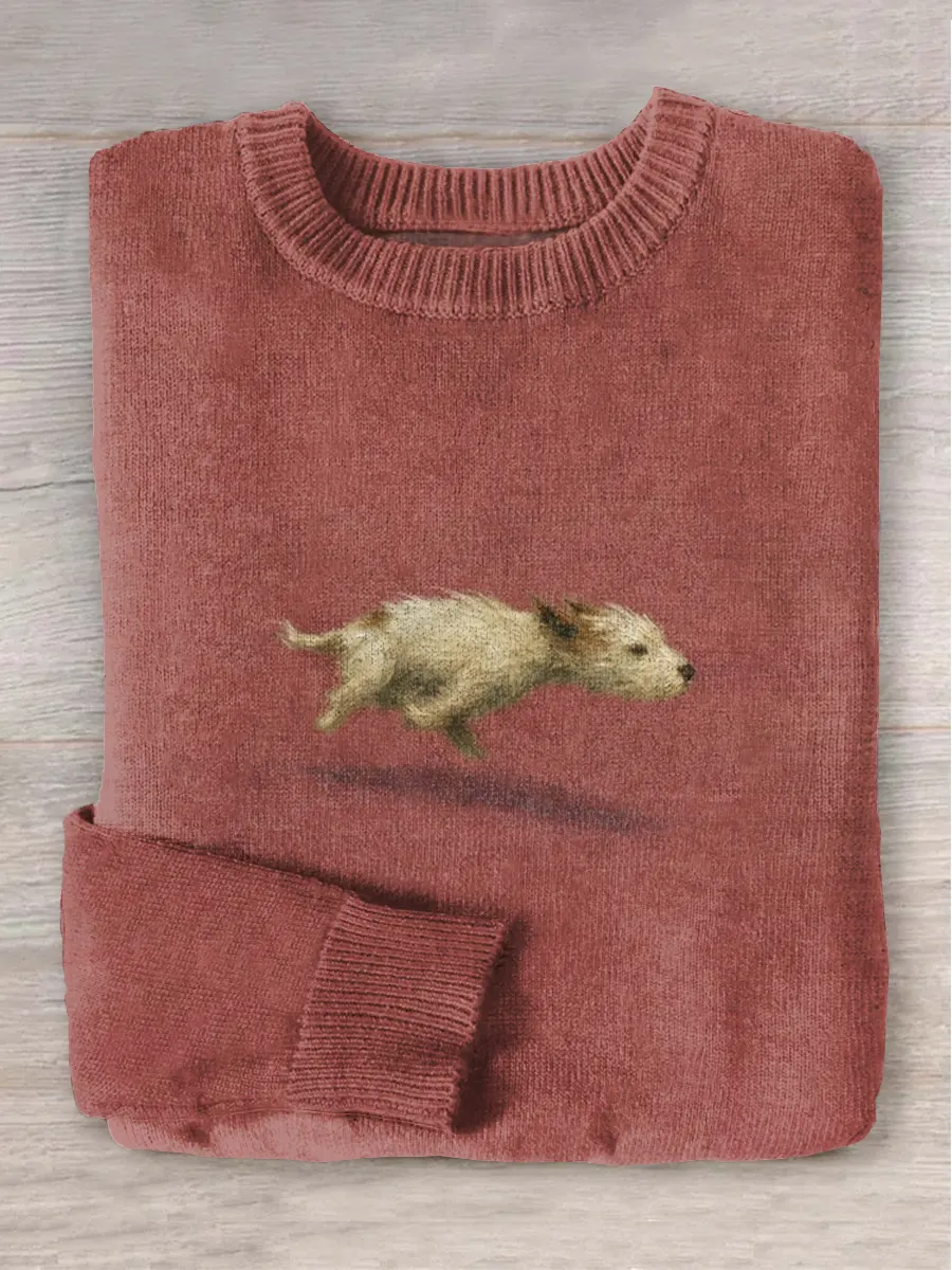 Funny Cute Running Dog Art Print Round Neck Long Sleeve Sweater