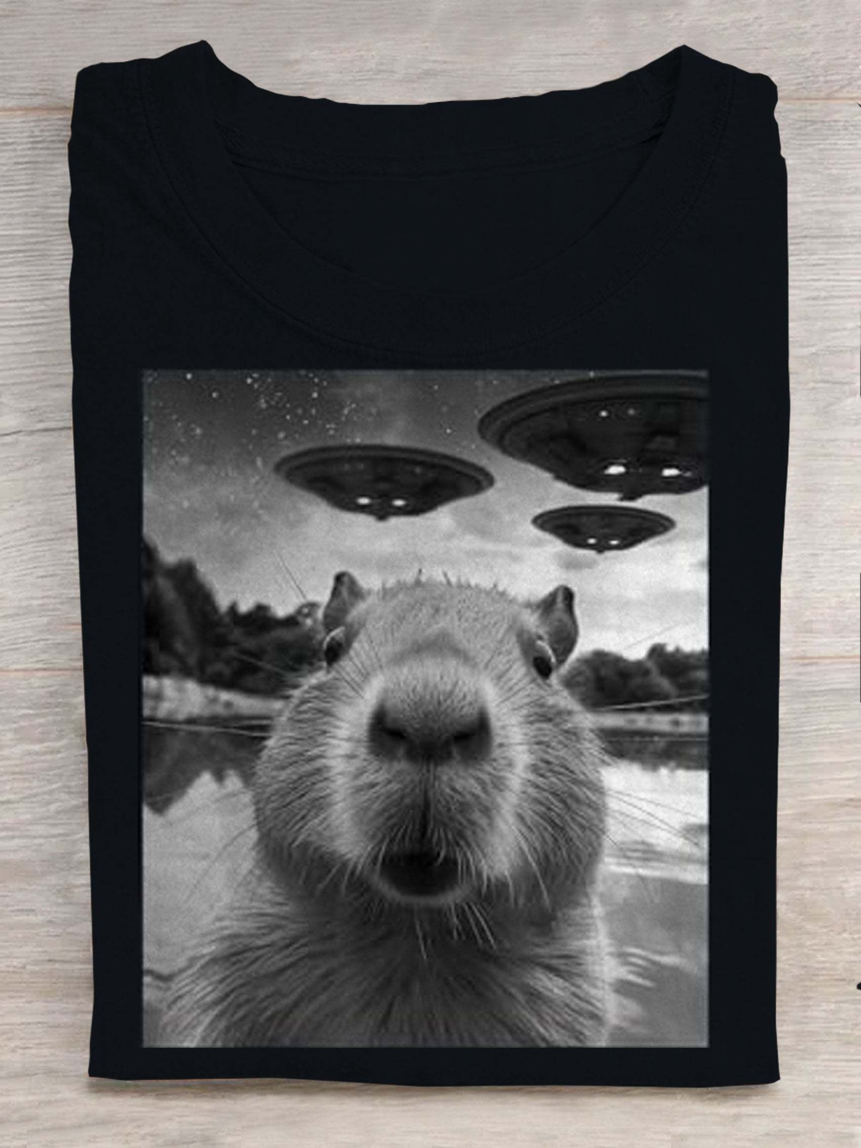 Funny Graphic Capybara Selfie With UFOs Weird Print T-shirt