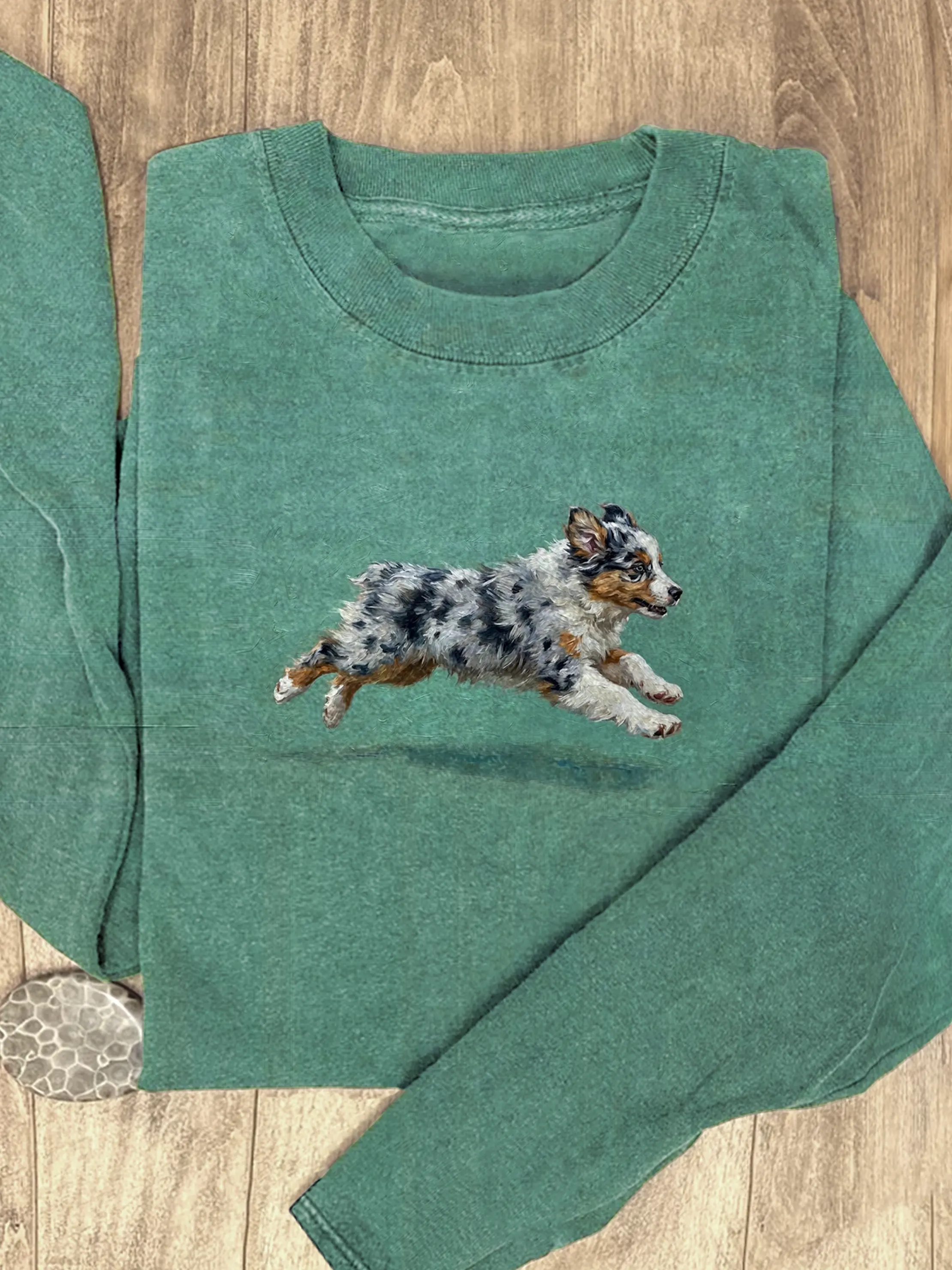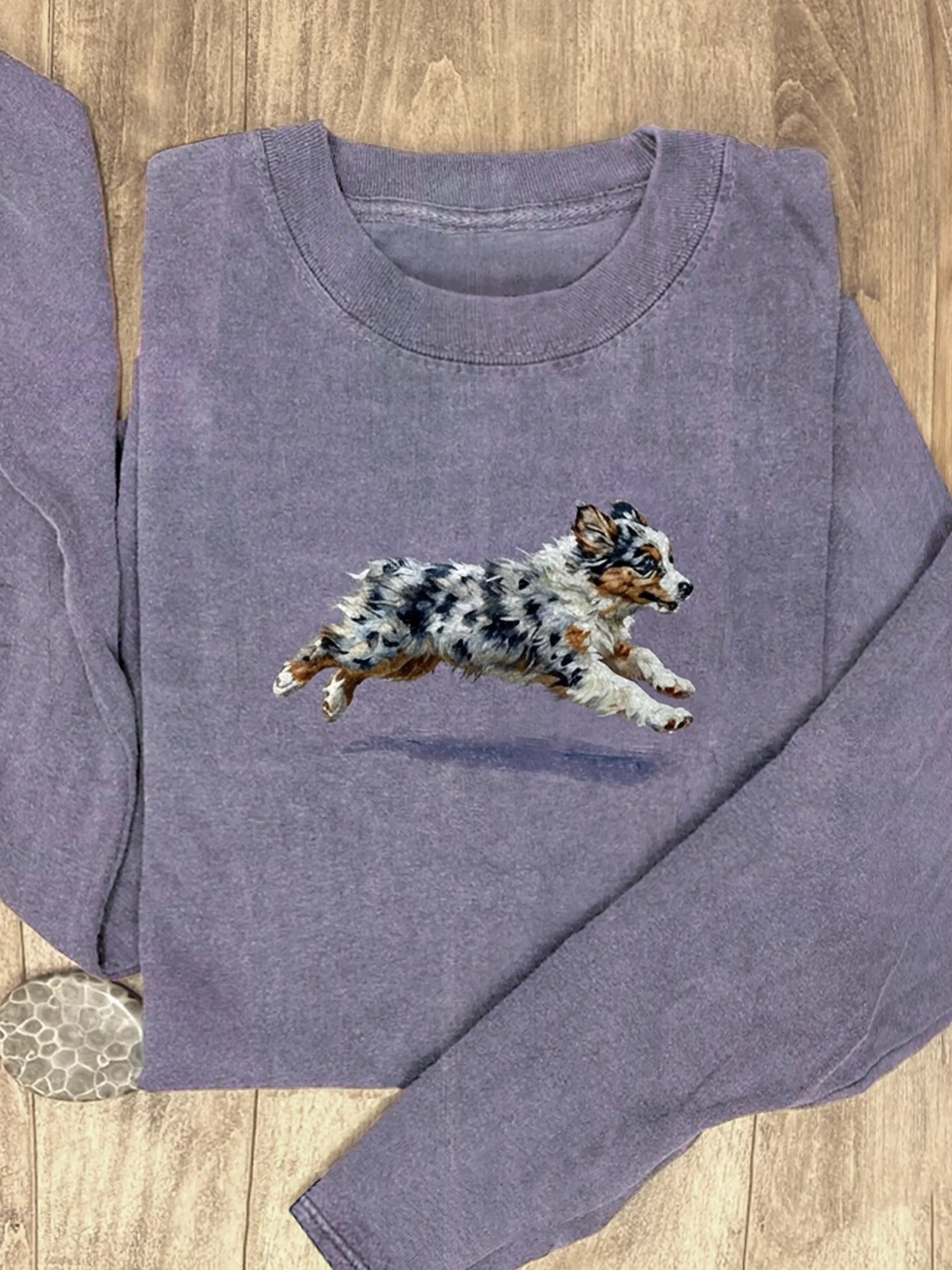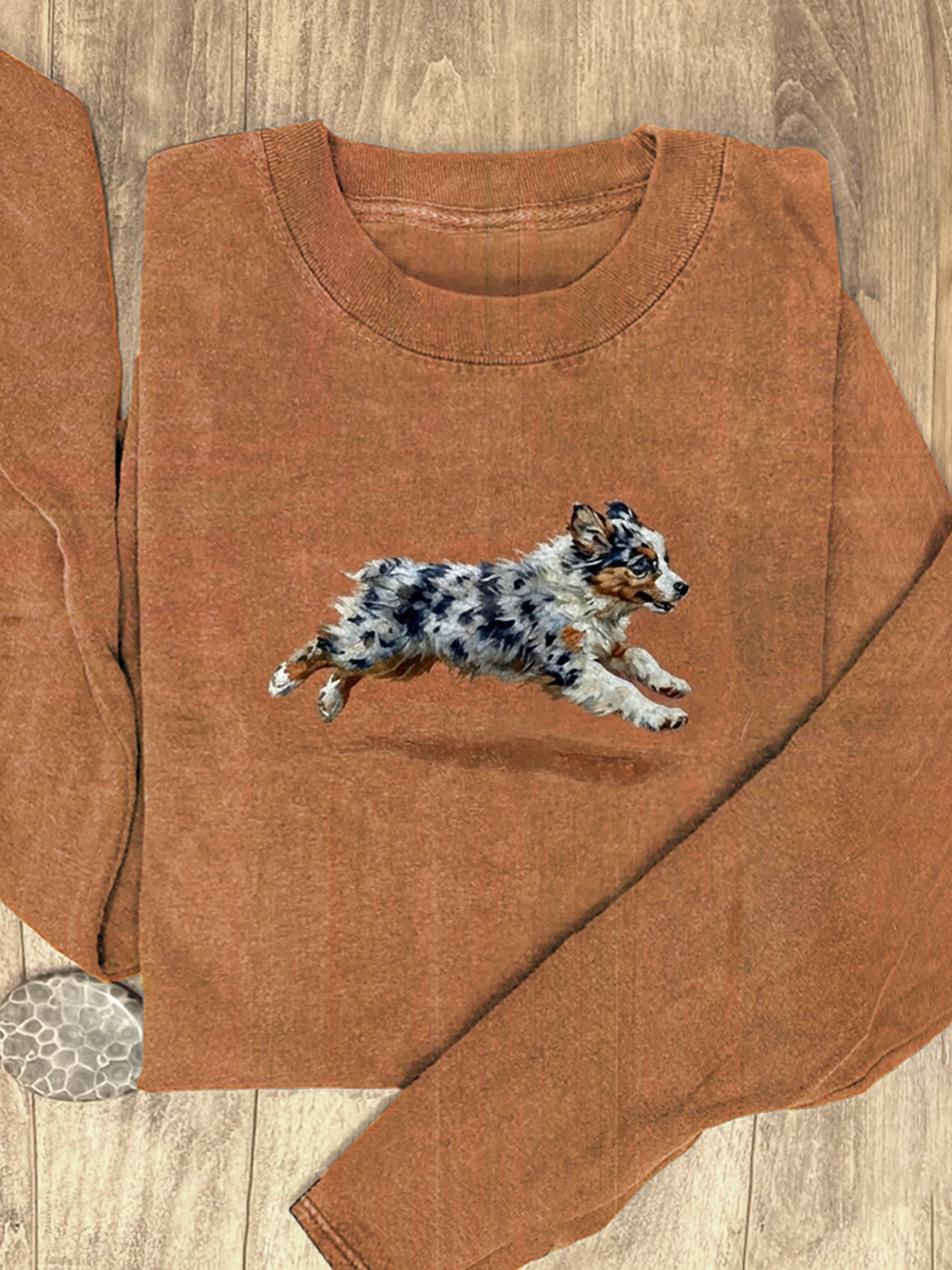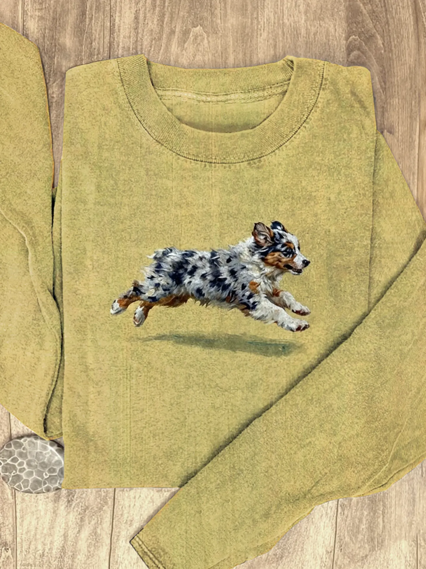 Funny Retro Cute Running Dog Art Print Casaul Cotton Long Sleeve Shirt