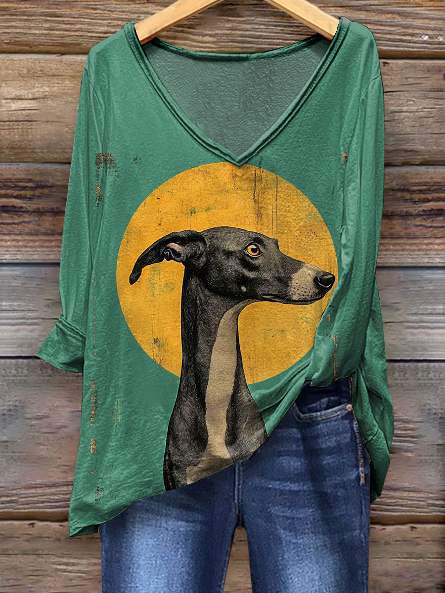 Greyhound Art Print Casual V-neck Long Sleeve T-shirt