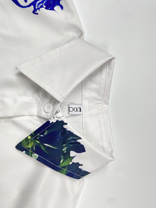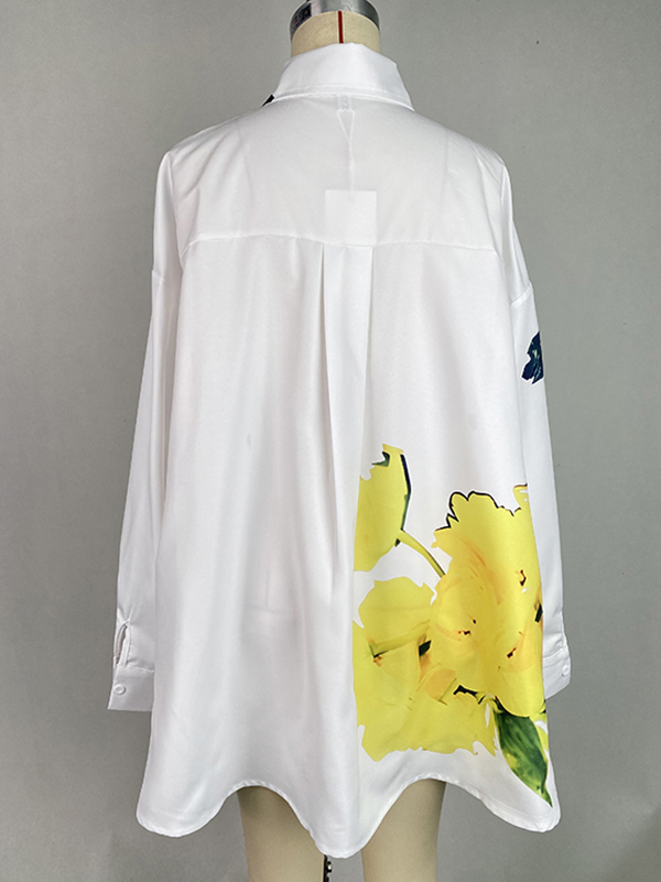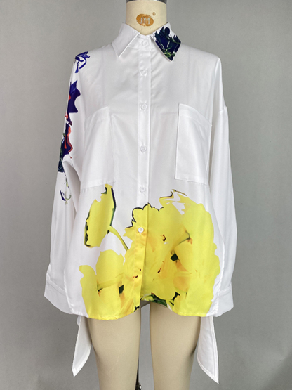 High-Low Long Sleeves Buttoned Flower Print Pockets Split-Side Stand Collar Blouses&Shirts Tops