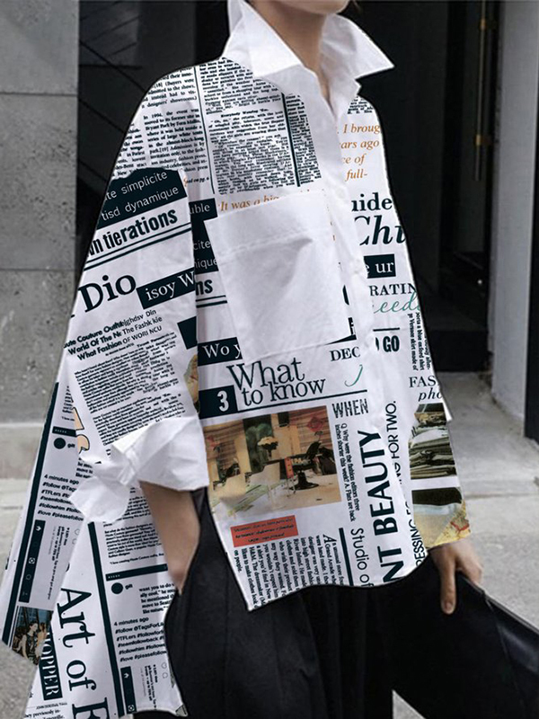 High-Low Long Sleeves Letter Print Pockets Split-Side Lapel Blouses