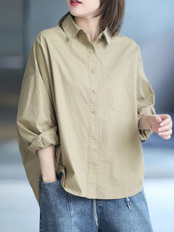 High-Low Long Sleeves Solid Color Lapel Blouses&Shirts Tops
