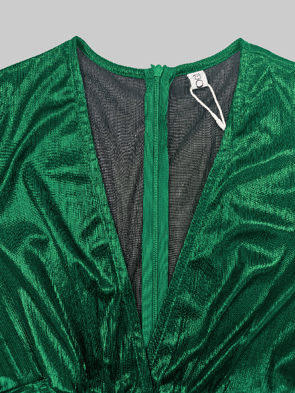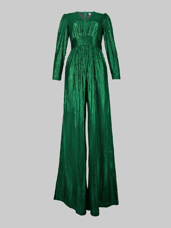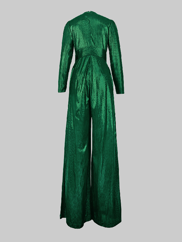 High Waisted Three-Quarter Sleeves Shiny Solid Color Deep V-Neck Jumpsuits Bottoms