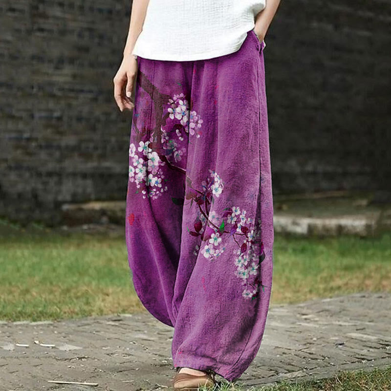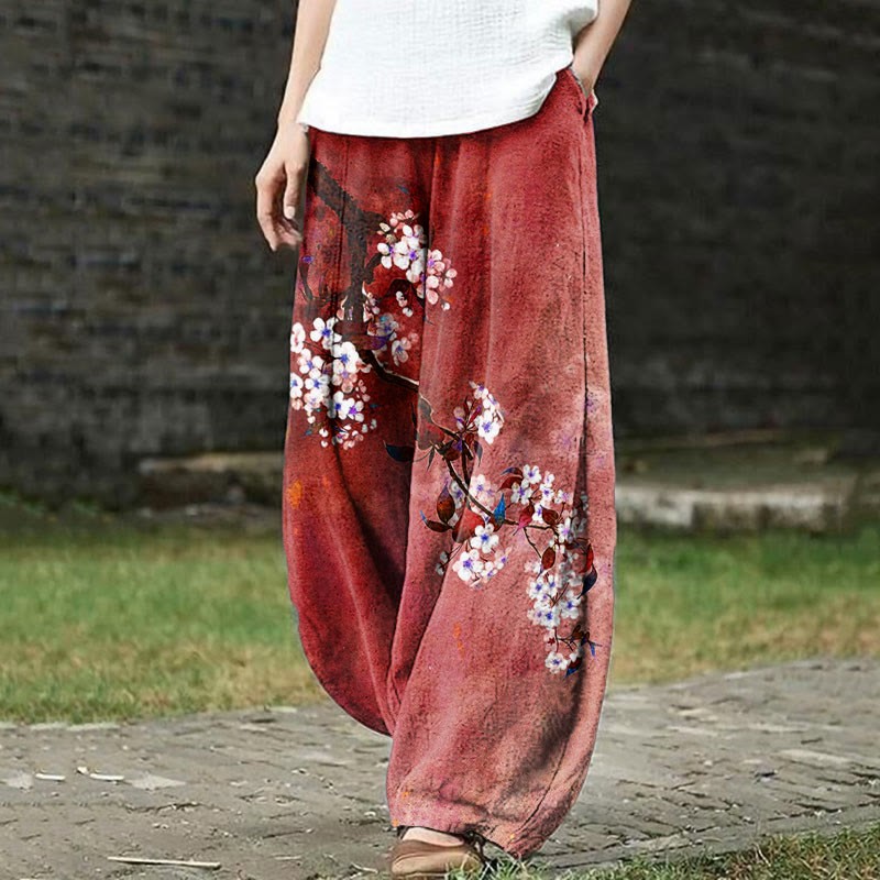 Dashingsoul Japanese Antique Pear Blossom Ink Painting Print Casual Pants