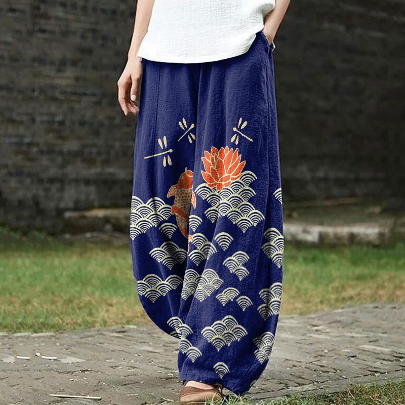 Dashingsoul Japanese Style Koi Fish Dragonfly Wave Art Print Casual Pants