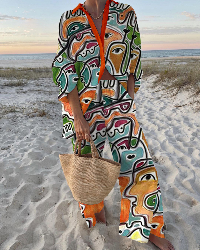 Line Art Face Print Shirt & Pants Two-Piece Set