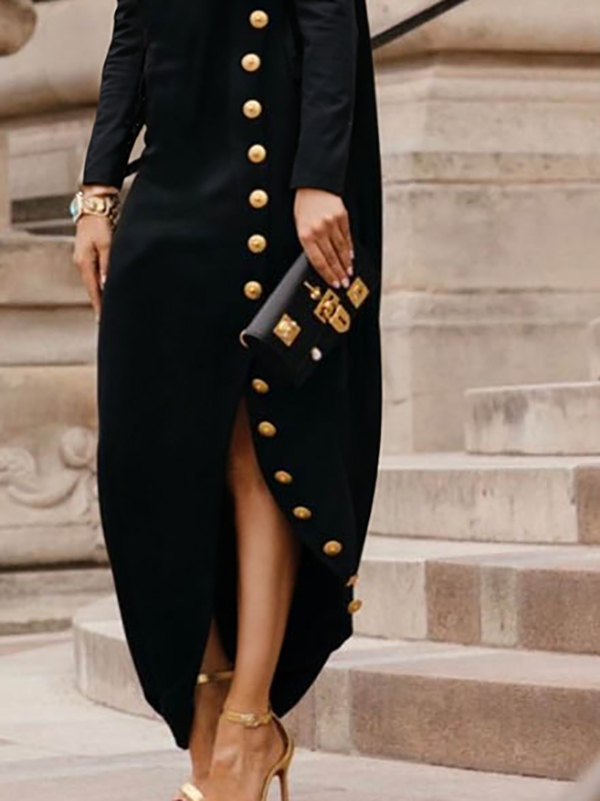 Long Sleeves Loose Asymmetric Buttoned Split-Joint Split-Side Mock Neck Maxi Dresses