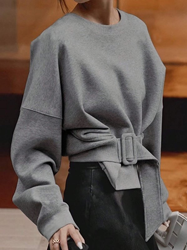 Long Sleeves Loose Belt Buckle Solid Color Round-Neck Sweatshirt Tops