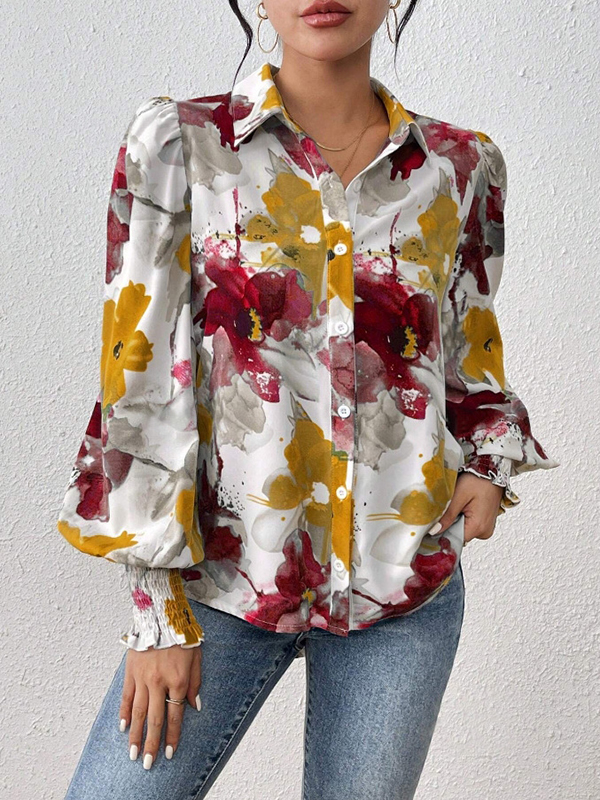Long Sleeves Loose Buttoned Elasticity Flower Print Pleated Lapel Blouses&Shirts Tops