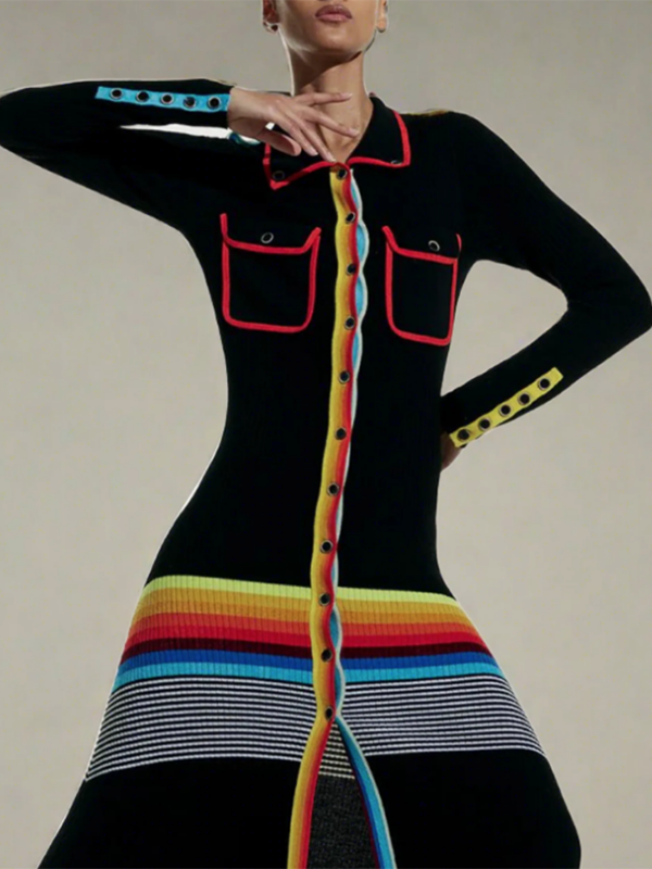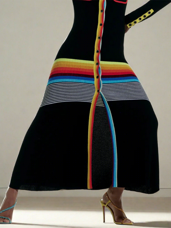 Long Sleeves Skinny Buttoned Contrast Color Striped Lapel Maxi Dresses Shirt Dress