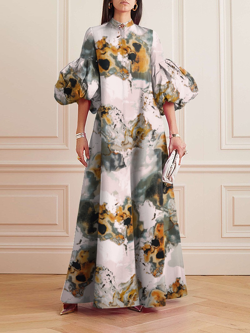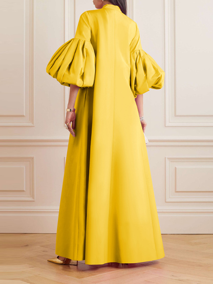 Loose Flower Shape Solid Color Stand Collar Lantern Sleeves Maxi Dresses
