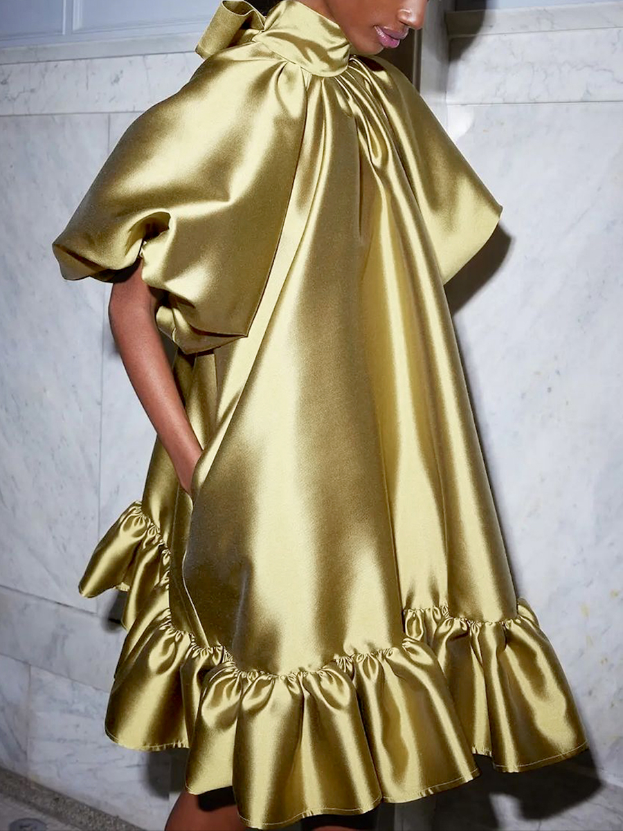 Loose Puff Sleeves Falbala Solid Color High Neck Mini Dresses Short Dresses