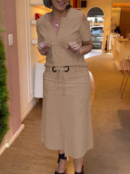 Loose Short Sleeves Solid Color Split-Joint Cold Shoulder Blouses&Shirts Tops