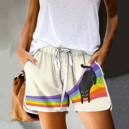 Rainbow And Black Cat Print Drawstring Pocket Shorts