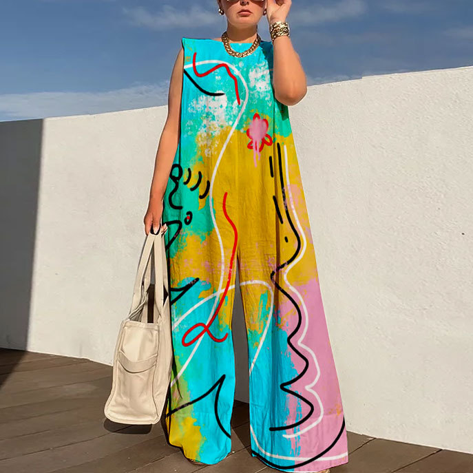 Sleeveless Wide Leg Shoulder Pad Printed Jumpsuits