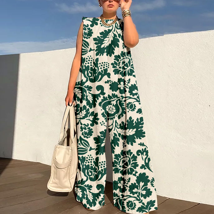 Sleeveless Wide Leg Shoulder Pad Printed Jumpsuits