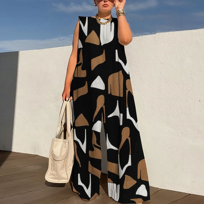 Sleeveless Wide Leg Shoulder Pad Printed Jumpsuits