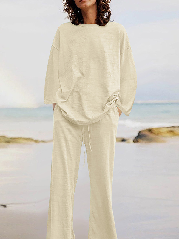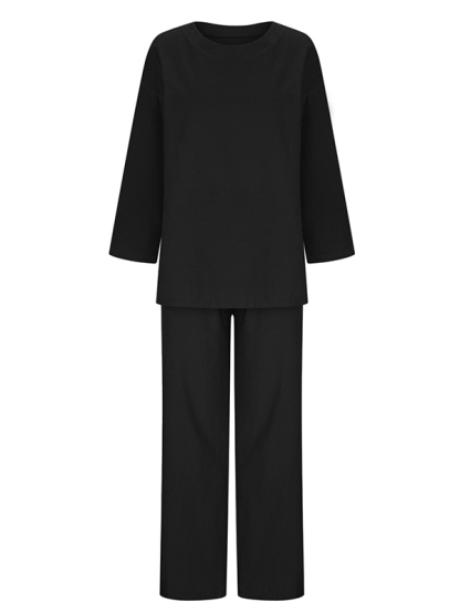 Solid Color Loose Long Sleeves Round-Neck Shirts Top + Drawstring Pants Bottom Two Pieces Set