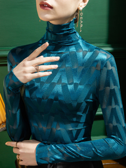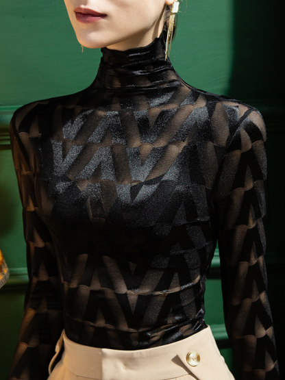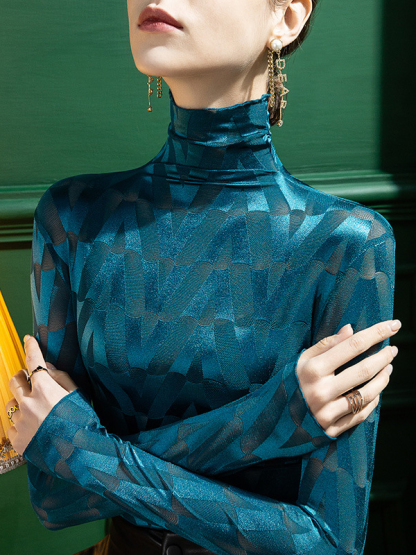 Stylish Skinny Long Sleeves Embroidered Split-Joint Checkered High-Neck T-Shirts Tops
