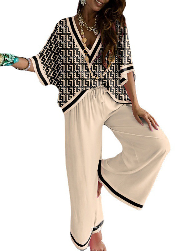 Urban Loose Printed V-Neck T-Shirts Tops& Drawstring Wide Leg Pants Suits
