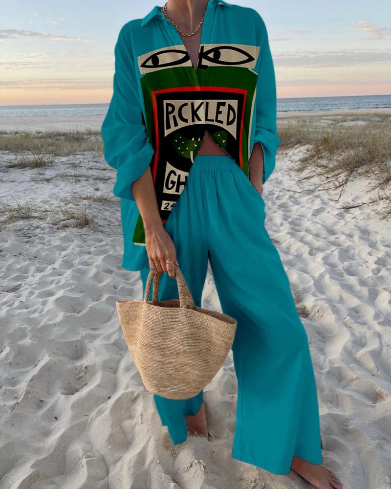 Vintage Fun Printed Shirt & Pants Two-Piece Set