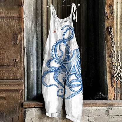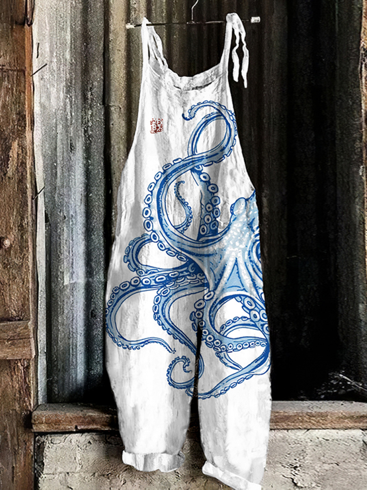 Vintage Japanese Art Octopus Print Casual Loose Jumpsuit