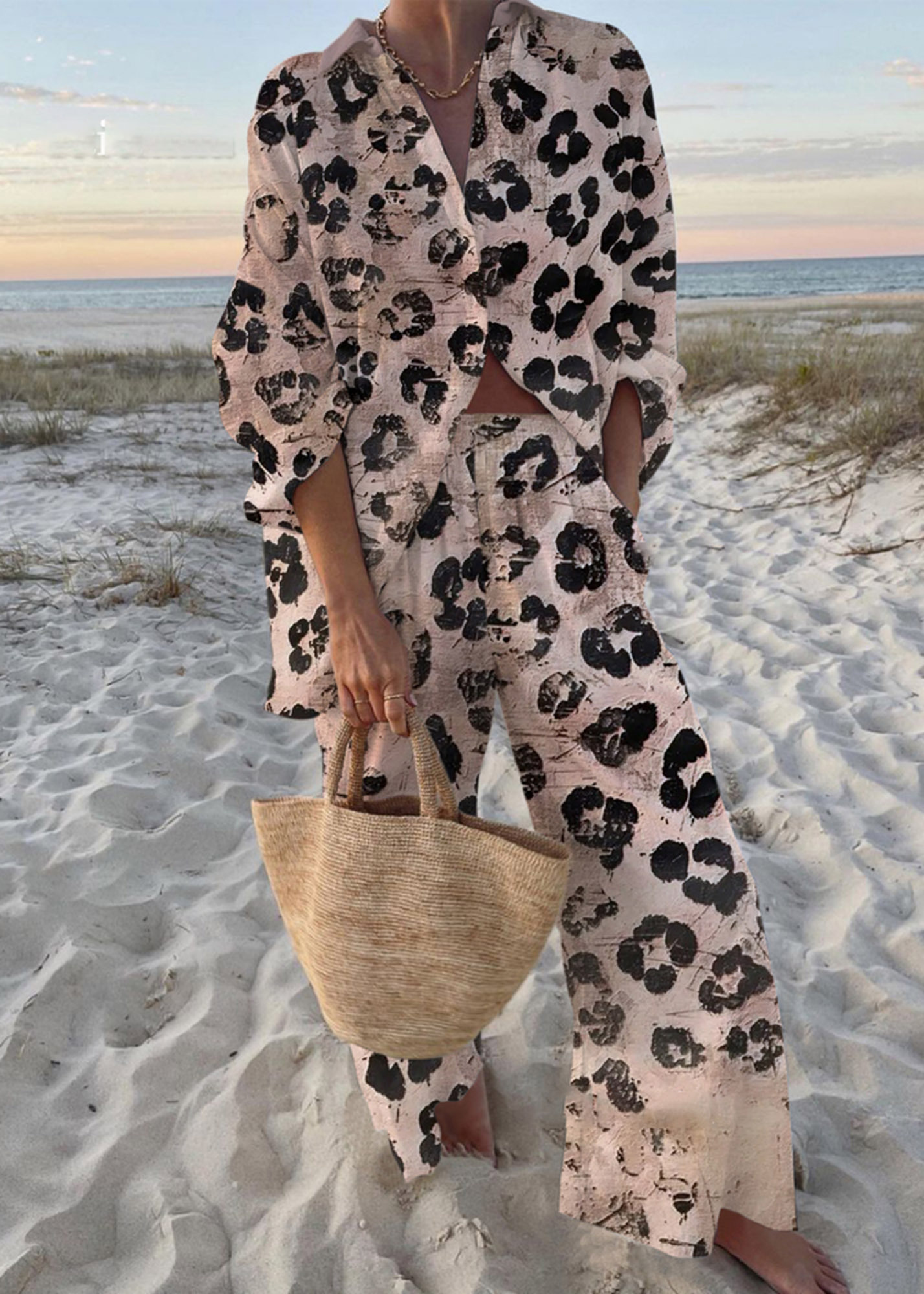 Vintage Leopard Print Two-Piece Shirt & Pants Set